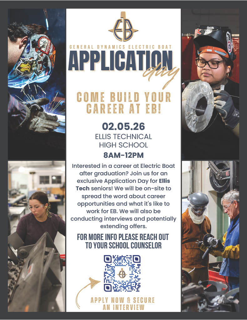Interested in launching your career with General Dynamics Electric Boat after graduation? Don’t miss this exclusive Application Day for Ellis Technical High School seniors!