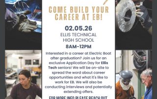 Interested in launching your career with General Dynamics Electric Boat after graduation? Don’t miss this exclusive Application Day for Ellis Technical High School seniors! Electric Boat representatives will be on site to share information about career opportunities, what it’s like to work at EB, and to conduct interviews on [...]